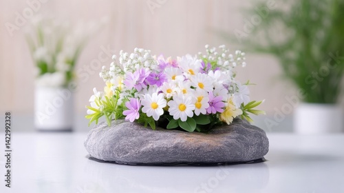 flower, arrangement, decorative, artificial, flower, spring, summer, bouquet, colourful, pretty, pastel, home, decor, table, desk, small, stone, rock, pot, display, garden, floral, nature, plant, green, white, purple, pink, yellow, daisy, centrepiece, gift, home decor, living room, bedchamber, office, tabletop, modern, simple, elegant, stylish, spring flower, summer flowers, gift idea, decoration, floral arrangement
