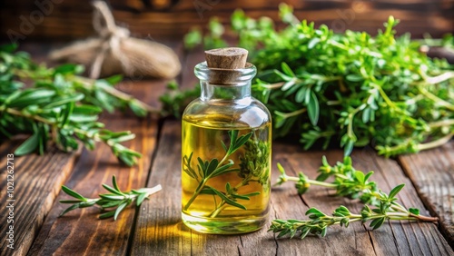A small glass bottle filled with a clear golden liquid and fresh sprigs of thyme, resting on a wooden surface, surrounded by additional sprigs of thyme.