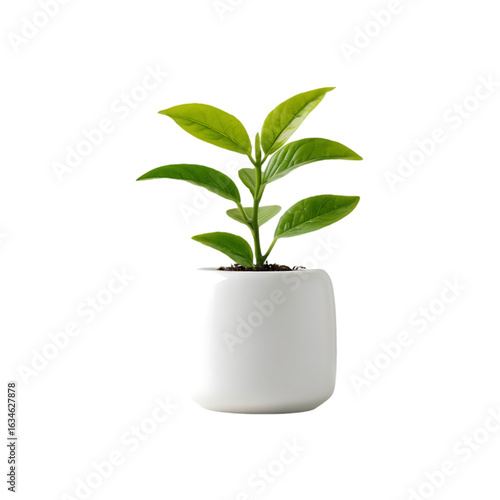 A small green plant in a white pot