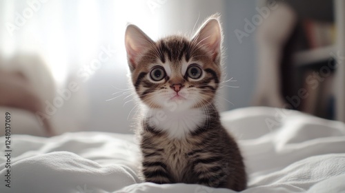 kitten, pet, animal, bed, bedchamber, window, sitting, cosy, home, interior, domestic, furry, soft, cute, little, small, sweet, adorable, morning, daylight, sunshine