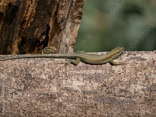 A small lizard basks in the sun on a warm spring day. The reptile moves along a tree branch. The life of reptiles in natural conditions.