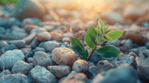 A small plant with green leaves emerging from a pile of rocks in sunlight