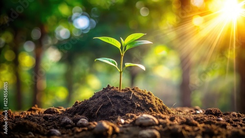 A small sapling emerges from the earth, its tender roots unfolding towards the warm sunlight that filters through the leaves of nearby trees , plant life, nature
