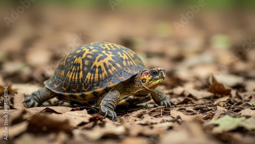 turtle, shell, yellow, black, leaf, forest, wildlife, animal, reptile, nature, walking, slow, small, tiny, creature, wild, free, green, brown, earthy, terrain, ground, leafy, environment, habitat, natural, scene, photo, image, picture, forest floor, dry leaves, leaf litter, wild animal