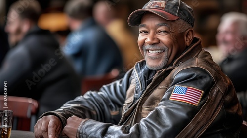 veteran, senior, black, military, jacket, flag, patch, hat, bar, pub, smile, friendly, leather, american, pride, camaraderie, social, people, casual attire, man, happy, relaxed, community, gathering, seated, drink, conversation, atmosphere, patriotic, service, honour, hero, warm, welcoming, interaction, culture, friendship, lifestyle, public, commercial, background, depth, shot, quality, wide, sharpened, field