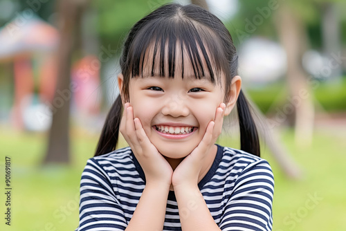 A smiling girl in a striped shirt enjoying a sunny day at the park surrounded by greenery and playground equipment