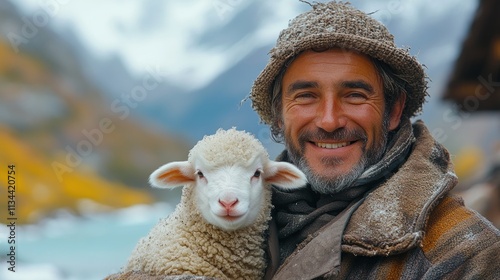 man, lamb, sheep, smile, nature, mountain, agriculture, rural, farm animal, portrait, happiness, outdoors, farming, landscape, connection, warmth, friendship, scenery, animal, farmer, environment, pastoral, country, joy, cute, fluffy, brown, wool, scenic, peaceful, idylli, community, tradition, lifestyle, habitat, care, nurturing, wildlife, heritage, quaint, rustic, beauty, love, family, bond, calmness, adventure, exploration, travel