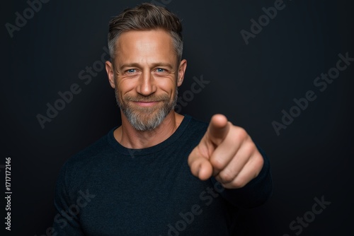 man, smile, beard, pointing, confidence, interaction, positivity, attitude, friendly, mature, community, warmth, personality, engagement, representation, attracted, image, expression, snapshot, male, mood, appearance, identity, dynamic, influence, gesture, optical, emotion, connection, photo, candid, vibrant, photogenic, portrait, sharpened, stylish, charisma, modern, clear, dark, character, style, casual attire, authenticity, background, charisma, approachable