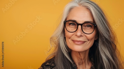 elegant, portrait, smiling, grey, hair, goggles, yellow, background, warm, inviting, confident, happy, friendly, cheerful, modern, mature, content, stylish, poised, relaxed, approachable, serene, positive, casual attire, comfortable, woman