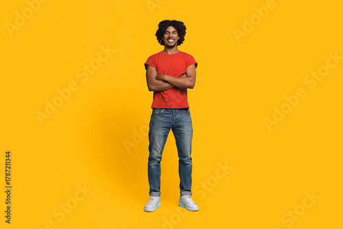 A smiling young man with curly hair is standing with arms crossed. He wears a red shirt and jeans, posing against a vibrant yellow backdrop. His expression is friendly and approachable.