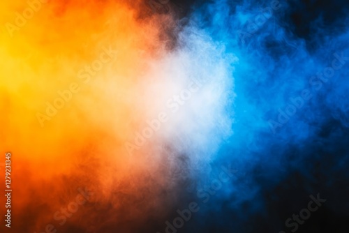 A smokey background with orange and blue colors. Abstract gradient background, with orange and navy blue hues, a grainy film texture