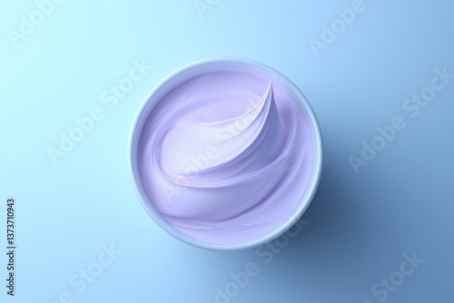 A smooth, lavender-colored cream swirls in a minimalist bowl against a soft blue backdrop, evoking calm and serenity.