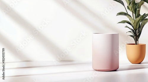 vase, plant, pot, shadow, surface, minimalist, interior, decor, home, clean, modern, design, light, pattern, background, still life, studio shot, neutral, organic, botanical, indoor plant, empty space, copy space, soft, gradient, pink, green, white, texture, zen, calm, serene, elegance, simplicity, aesthetic, contemporary, home decor, lifestyle, natural light