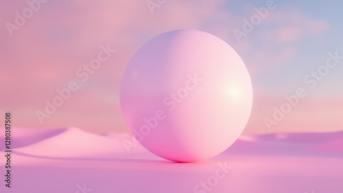 A smooth, pink sphere sits on a pastel pink surface with a soft, blurred background of pink and blue hues.