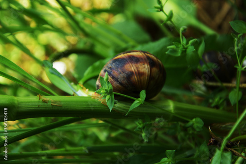 A snail creeps on a stem of grass.