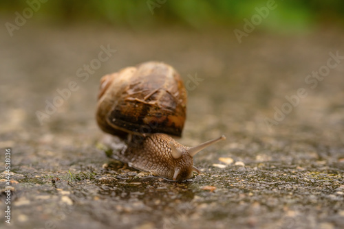 A snail in close-up crawling slowly on wet ground during a rainy day