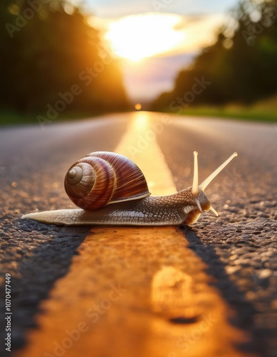 A snail moving across road, symbolizing patience, persistence, and gradual progress