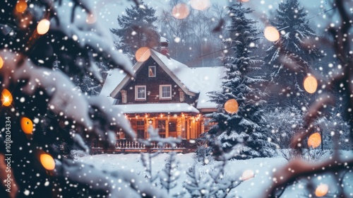 A snow-covered house among frosted trees sparkles with fairy lights, creating a picturesque and serene winter scene filled with warmth and enchantment.