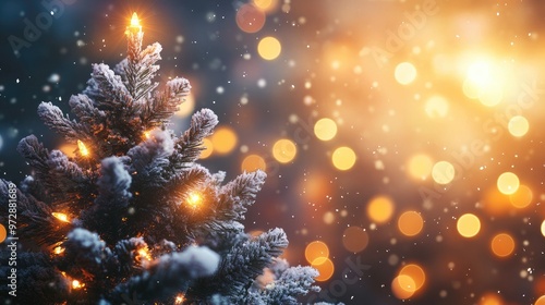 A snowy Christmas tree with twinkling lights against a bokeh background.