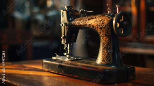 A softly lit scene of an old sewing machine on a wooden table, with a shallow aperture to highlight the intricate details, a copy space