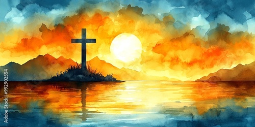 sunset, cross, water, faith, hope, sky, cloud, mountain, orange, yellow, blue, silhouette, peaceful, tranquil, serene, spiritual, landscape, nature, artwork, painting, watercolor