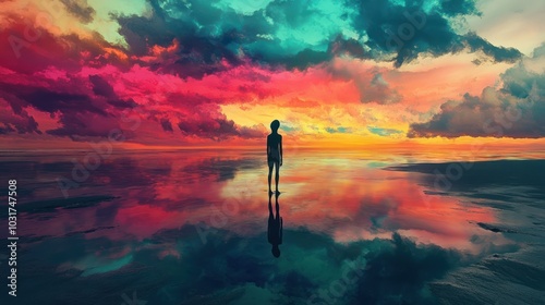 A solitary figure stands in a vibrant, reflective landscape at sunset, evoking introspection.