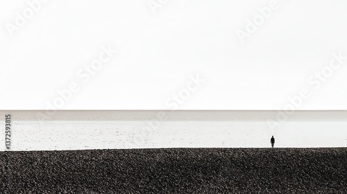A solitary figure stands on a vast shoreline, embracing tranquility and solitude.