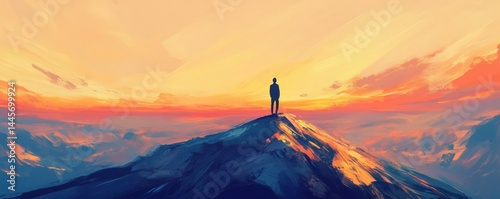 mountain, peak, silhouette, person, figure, sky, sunset, cloud, orange, yellow, red, blue, landscape, nature, view, horizon, light, colours, brushstroke, paint, art, travel, adventure, climb, freedom, exploration, outdoors, dawn, dusk, inspiration, achievement, strength, solitude, elevation, distance, journey, up high, looking, huge, vibrant, scenic, tranquil, calm, peaceful, beautiful, majestic