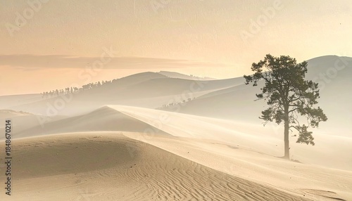 desert, dune, sand, tree, solitude, landscape, mist, fog, haze, sunrise, sunset, golden hour, beige, earth-tone, serene, tranquil, immensity, nature, scenic, wilderness, lonely tree, pine, evergreen, craggy, layered, atmospheric, soft light, warm tones, minimalist, abstract, remote, arid, environmental, dramatic, calm, peaceful, silhouette, horizon, sky, earth, weather, geography, terrain