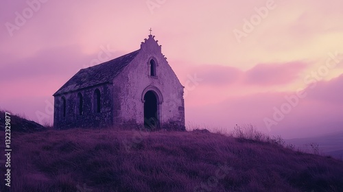 A solitary stone chapel stands atop a grassy hill, bathed in the soft glow of a purple dusk sky, exuding solitude and peace.