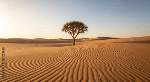 A solitary tree stands in the vast, undulating sand dunes of a desert landscape under a clear, bright sky at sunset or sunrise.