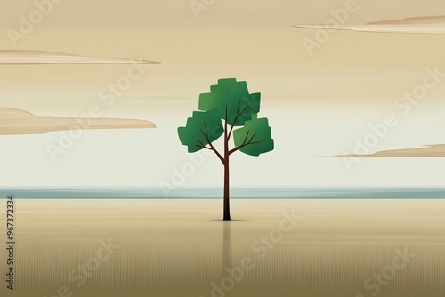 A solitary tree stands tall in the center of a vast, flat, and seemingly endless field, set against a soft, serene morning sky with hues of warm beige and pale blue, illustrated in a flat color style