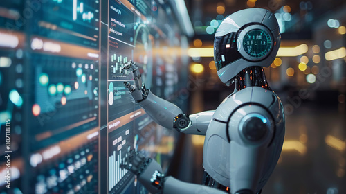A sophisticated robot with a digital face analyzes data on a high-resolution display, showcasing futuristic artificial intelligence in use.