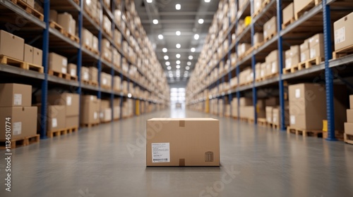 A spacious warehouse filled with neatly stacked boxes, highlighting one prominent box in the foreground, illuminated by bright overhead lights.