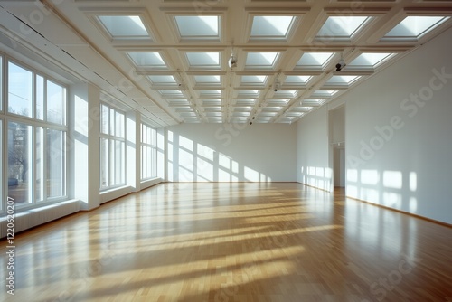 A spacious, well-lit interior design style gallery with large windows and a coffered ceiling. The sunlight casts long shadows on the polished wooden floor, creating a serene atmosphere.