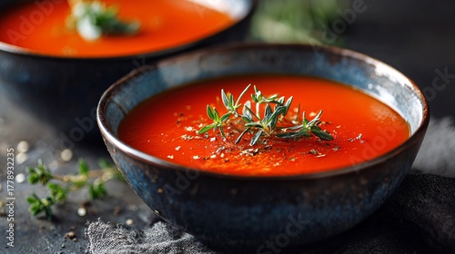 tomatoes, cookery, bowl, soup, spicey, meal, lunch, food, dinner, fresh, hot, tomato soup, epicure, healthy, green, traditional, red, vegetable, tasty, delicious, healthy eating, dish, herb, fine dining, gastronomy, pepper, plate, culinary arts, vegetarian meal