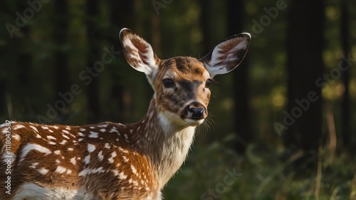 A spotted deer fawn faces forward in a forest
