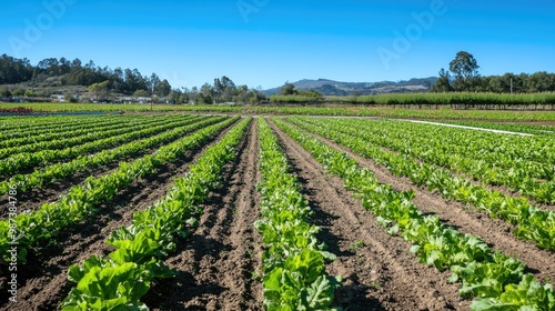 A sprawling vegetable farm with rows of green and root vegetables growing under a clear blue sky
