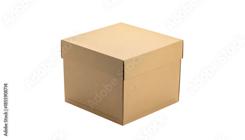 A square, brown, cardboard box with a lid, isolated against a solid black background