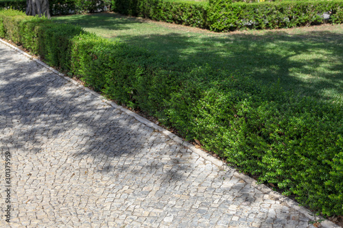 A square with a hedge and the Portuguese stone floor