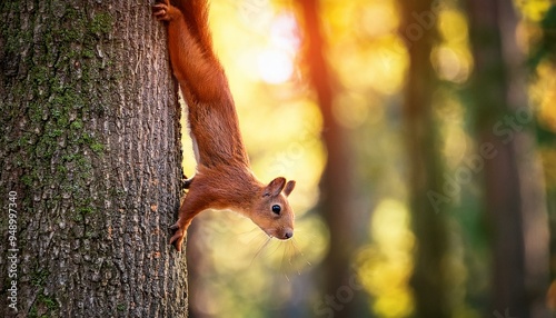 A squirrel climbing on the tree in the forest