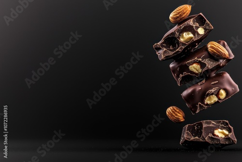 A stack of chocolate bars with nuts is suspended mid-air, creating a dynamic and indulgent visual against a dark background.