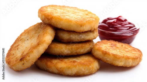 A stack of golden, crispy potato cakes is presented alongside a small bowl of ketchup, This appetizing image is perfect for food blogs, menus