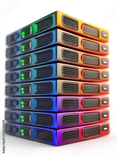 A stack of vibrant, modern storage devices with glowing indicators, suitable for technology-related projects, data management, or cloud services visualizations,