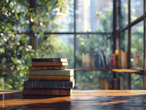 A stack of vintage books on a wooden table, surrounded by greenery and modern architecture through a large window.