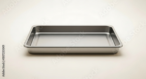 A stainless steel baking pan sitting on a white surface in a studio setting with soft lighting