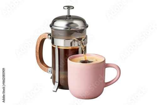 A stainless steel French press coffee maker with a handle, pouring liquid into a cup on isolated on a transparent background in PNG format.