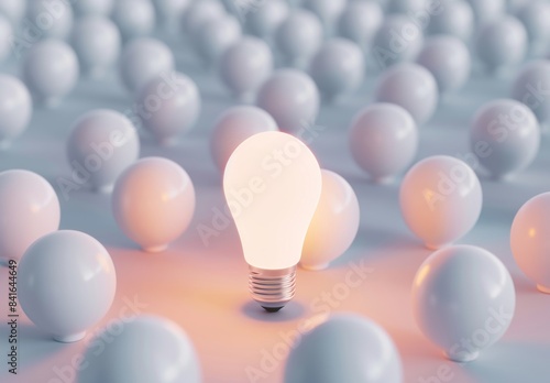 A standout light bulb shines brightly among others on a white background, symbolizing creativity, inspiration, innovation, and thinking differently. 3D rendering illustration.