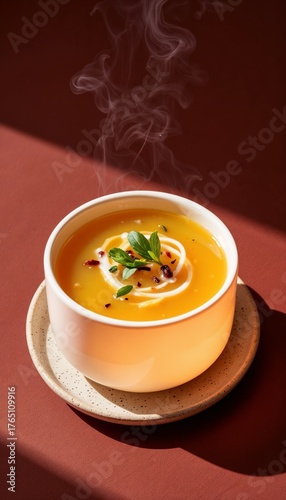 soup, steaming, bowl, herb, food, warm, orange, dish, delicious, meal, cooking, culinary, comfort, healthy, ingredient, broth, hot, cosy, kitchen, dining, rustic, appetising, dinner, lunch, eating, kitchen utensile, vegetarian, creamy, spice, epicure, nourishment, presentation, modern, indoor, artisanal, season, aroma, favor, soup bowl, plate, comforting, colours, freshness, culinary arts, vegetarian dish