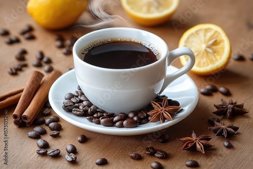 A steaming cup of black coffee on a white saucer surrounded by coffee beans, star anise, cinnamon sticks, and lemon halves on a wooden surface evoking warmth and comfort